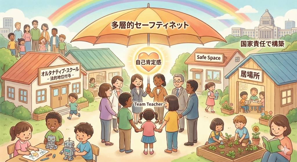 不登校や孤立に苦しむ子供を、もう一人も死なせない。学校を単なる知識伝達の場ではなく、命を守る「多層的セーフティネット」へと進化させます。専門家が連携する「チーム担任制」を確立し、オルタナティブ・スクールにも法的地位を付与します。どんな環境の子も自分自身を大切にする「自己肯定感」を持ち、等しく学べる教育環境を国家責任で構築します。